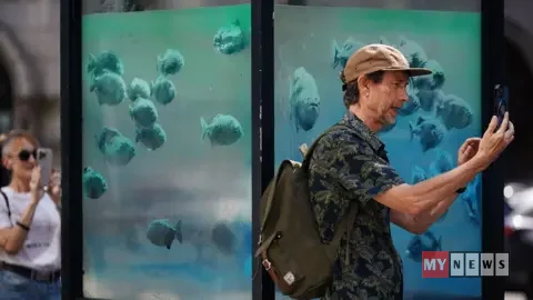 Called ‘Piranhas’, the work includes spray-painted fish on a police sentry box in the City of London.