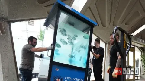 Called ‘Piranhas’, the work includes spray-painted fish on a police sentry box in the City of London.